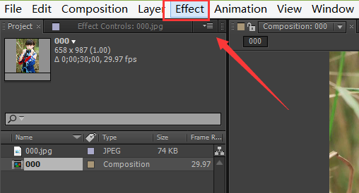 3、在import对话框内找到我们需要编辑的图片,点击打开图片就在project里出现了,使用鼠标左键将该图片拖拽到composition窗口内,如图所示: