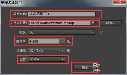 3、首先创建一个项目。点击Au左上角的文件-新建-多轨合成项目,项目名称可以自己取,文件夹位置放在一个自己容易找到的地方(我直接放桌面),采样率选44100,主控选立体声
