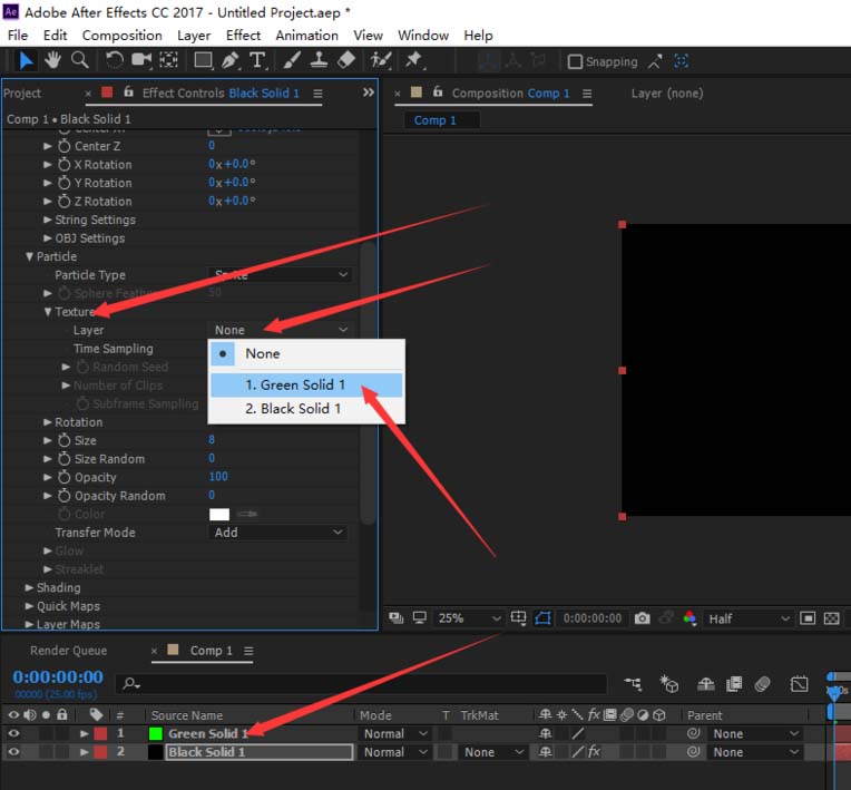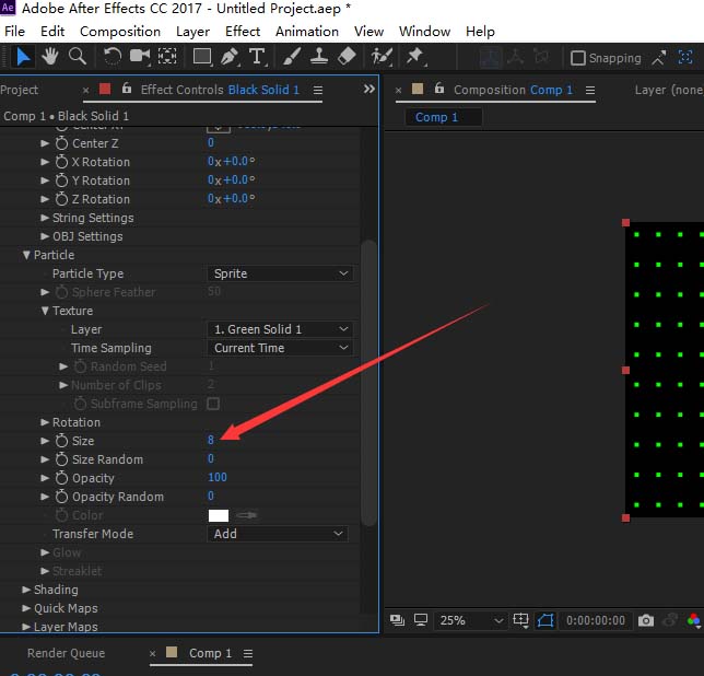 6、调节粒子样式,替换成新建的比较小的固态层。