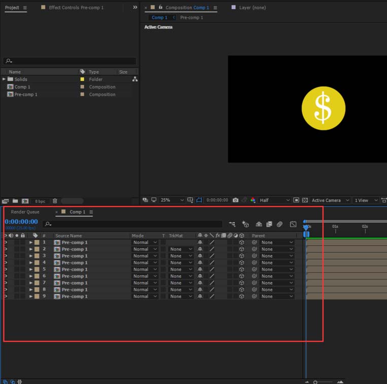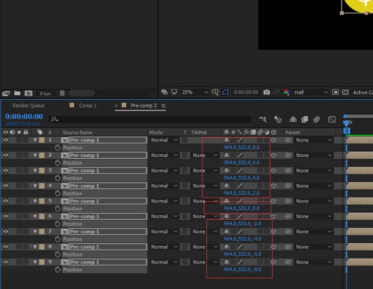 5、复制八个预合成出来。(复制的数量可以多可以少,但是合成的总数必须是但数个)