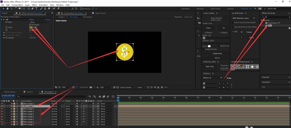 7、给第二到第八个合成添加填充效果,填充比硬币稍微中一点的颜色,目的是让硬币翻转的时候有阴影的效果。