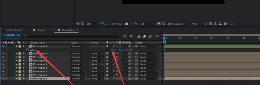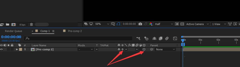 9、将所有的合成合并为一个预合成,并且打开小太阳标志和三维层开关。