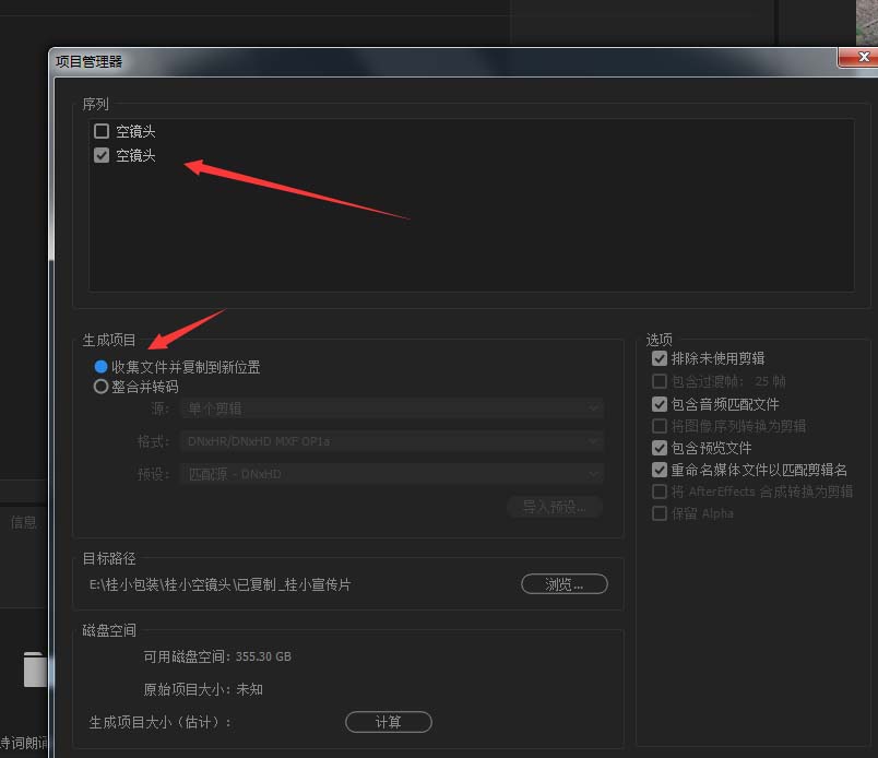 2、点击源头,就是你序列的名字,再次看下面点击收集文件素材的选项,