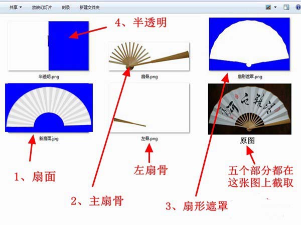 首先,要在百度图片下载一幅高清折扇图片,用PS软件分解成好几个png图片,保存在同一个文件夹。如下图: