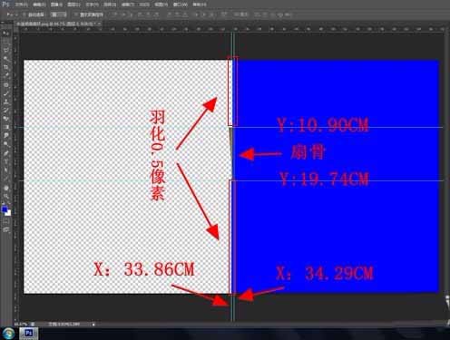 第五步是制作半透明的一张图,在ps上新建1920×1080画布,分割左边一半为透明的,右边一半是蓝色,RGB值同前。打开折扇左骨,用移动工具将其拖曳到半透明半蓝色的中心(紧贴着蓝色),ctrl+t自由变换,位置大小大概数值如下图。(有时要微调)