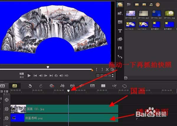 启动会声会影X10,将设置→项目属性设为DVD(720×576,16:9,25p,8mbps);参数选择→常规→背景色设为蓝色(RGB值同前);再将编辑里的默认照片/色彩区间设为10秒(此例为10.23秒)。接着,将覆叠轨设为5或6条。在覆叠轨1导入装饰扇面的花朵、风景、国画、人物等照片,再在覆叠轨2导入透明扇面,调到屏幕大小,再编辑→抓拍快照。快照就自动保存到“我的文档”会声会影X10的目录下,在素材库出现。