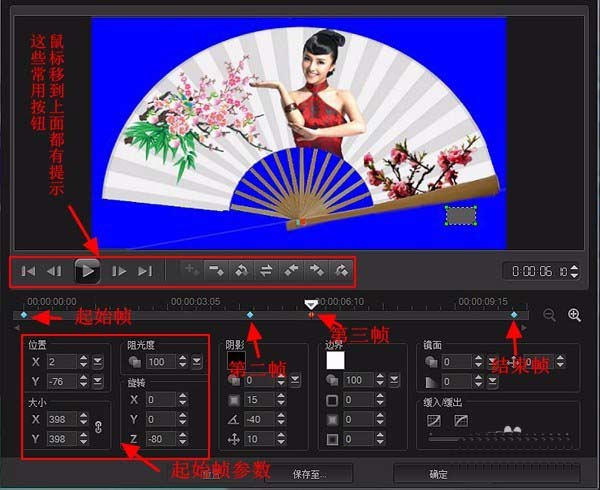 接着将鼠标在时间轴05.02秒处双击,添加第二帧,只改动Z为-80;然后在06.10处双击添加第三帧,参数和第二帧一样,再转到结束帧,将参数设成和起始帧一样。点击设置面板上播放,满意了就点击“确定”。