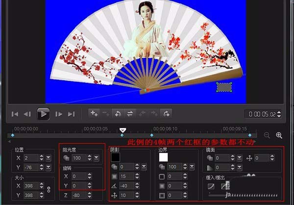 扇面如果不透明,就在覆叠轨3导入背景透明的花朵、人物等png图片,调好位置。同样抓拍快照。想制作多种扇面变换就如此操作。完成后默认大小是1024×576。(也可用PS制作扇面)