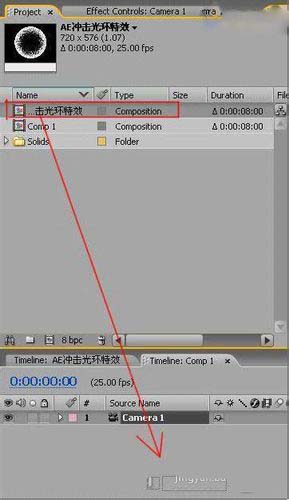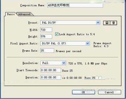 3、在弹出的新建合成窗口中,Composition Name输入为AE冲击光环特效,Preset设置为PAL D1/DV,时间设置为8秒。