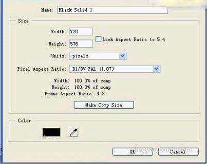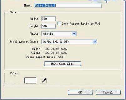 5、在弹出的新建固态层窗口中,设置大小与合成相同,点击Make Comp Size即可,同时设置Color为白色。