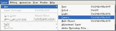 14、为新建立的合成添加一个摄像机层,点击:Layer—New—Camera,参数全部使用默认。
