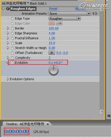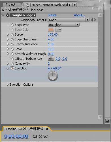 10、按F3键,打开特效控制面板,设置RoughenEdges的参数,具体参数如图10所示。将时间设置到0秒,点击Evolution前面的关键帧按钮,为其添加一个关键帧,并设置参数为0。
