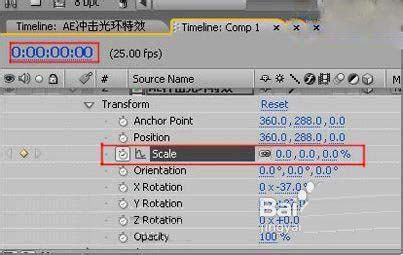 18、将时间设置为0秒处,展开Scale的参数,点击前面的关键帧按钮,设置关键帧。
