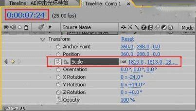 19、将时间设设置到7秒24帧处,如图19所示。设置Scale的值为1813,系统自动在这个位置添加一个关键帧。