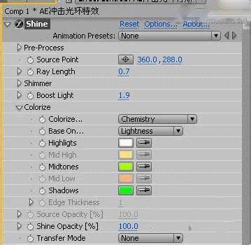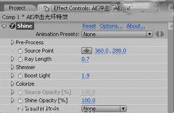 21、按F3键,打开特效控制面板,设置Shine的参数,其中Ray Length:0.7,Boost Light:1.9。