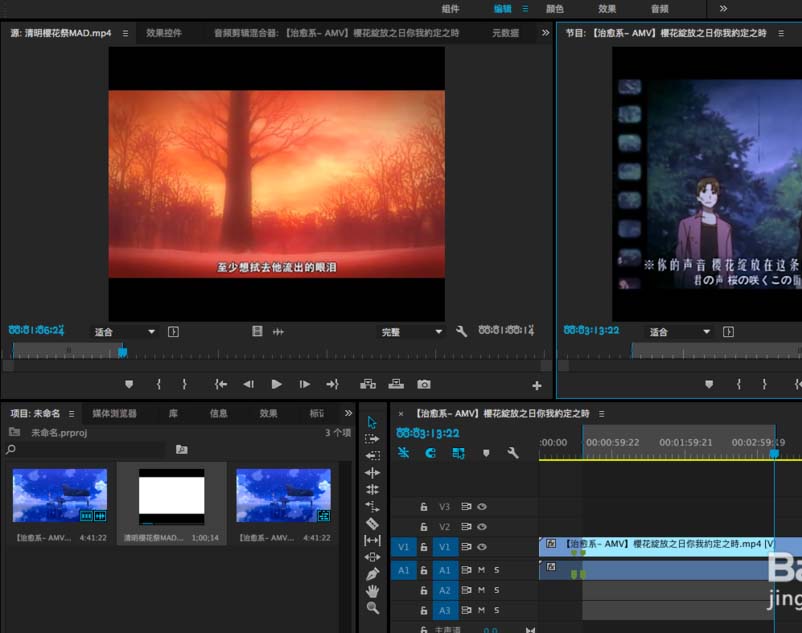 1、首先我们导入三段视频素材,也就是需要剪辑的三段,将这三段放在项目中就可以了,因为原理是一样的,所以这里小编就以两段视频素材为例