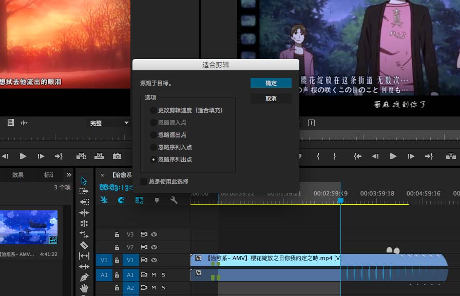 3、这时就不像三点编辑一样一下子就好了,会弹出一个选项框,里面大致有两种类型,一种是填充,一种是忽略节目出入点,我们先选一下填充看看