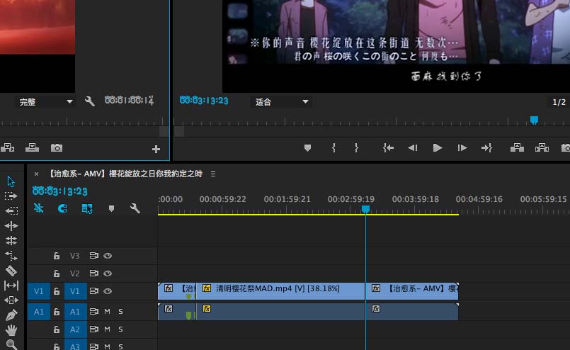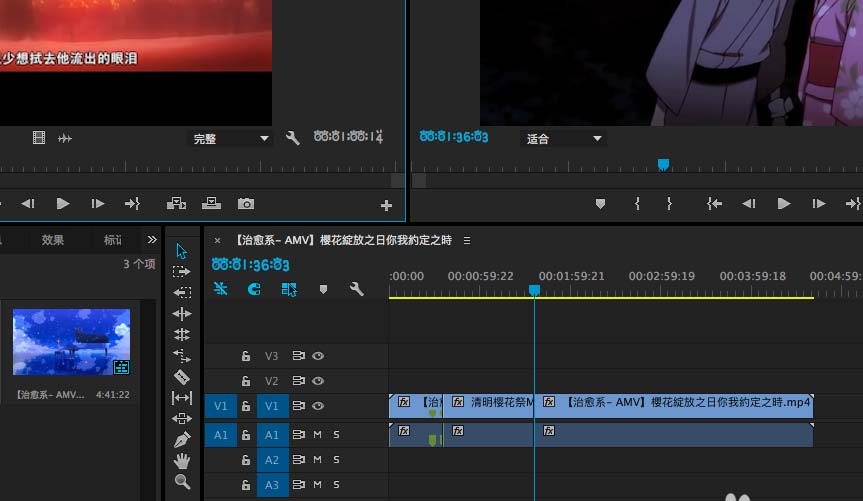4、可以看到整个视频的长度没有变化,也就是源上标记的一部分完全替代了节目上标记的一部分,这样做会改变替换掉的这一段的速度,毕竟两段的时间是不一样的