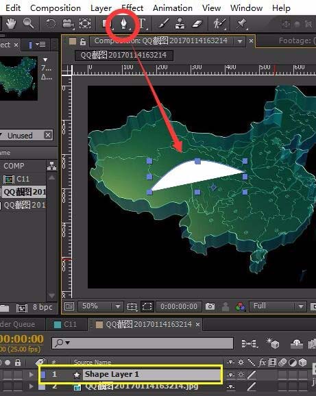 2、然后不要选中底图,选中钢笔工具,在视图窗口点击就可以新建一个形状图层Shape Layer 1,然后我们绘制出来如图所示的一条曲线(和MASK绘制方法一样)。