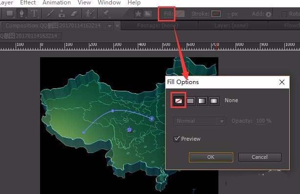 3、选中Shape Layer 1图层并选中钢笔工具,在如图所示的设置图标上点击Fill,在弹出窗口中设置为none。