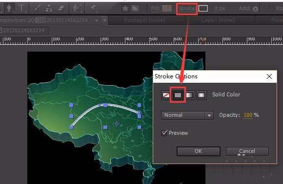 4、选中Shape Layer 1图层并选中钢笔工具,在如图所示的设置图标上点击stroke,在弹出窗口中设置为solid color。这样就可以让图形变成线形了。