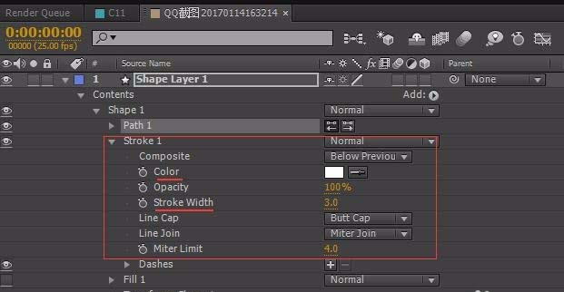 5、然后通过展开Shape Layer 1图层可以进一步设置stroke的颜色、宽度等参数。