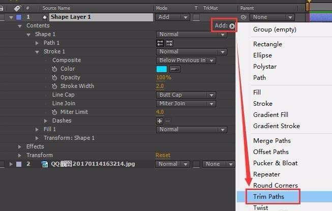7、在如图所示的地方点击Add旁边的小三角,给形状图层加一个Trim paths的效果。