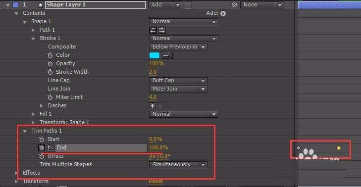 8、然后展开Trim paths,对End添加关键帧,初始关键帧设为0,第二个关键帧设为100。