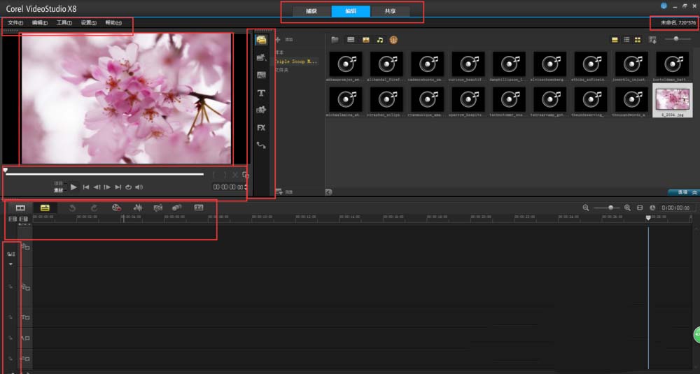会声会影常用的工具有哪些,打开首页界面看到的大大小小各种各样的按钮图标,可能会有点蒙圈,这些都是做什么的呢?用来干什么呢?小百合用【红色线框】所框出来的就是基本的应用界面,那么小百合就给网友们来分享下它们的作用。