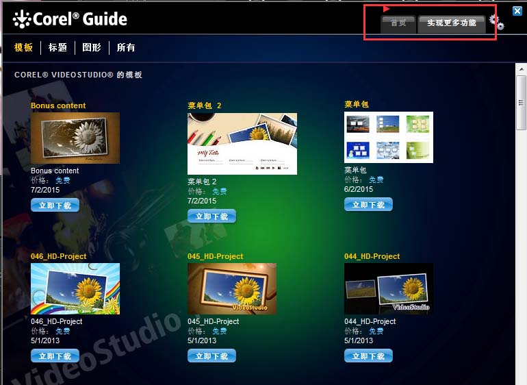 4、在首页的中间位置可以看到如图所示的【小黄色图标】鼠标点击就进入到这样一个界面,可以看到【实现更多功能】这一个工具栏,这里有一些免费的图片和模板,不一定用的上,看个人喜欢。