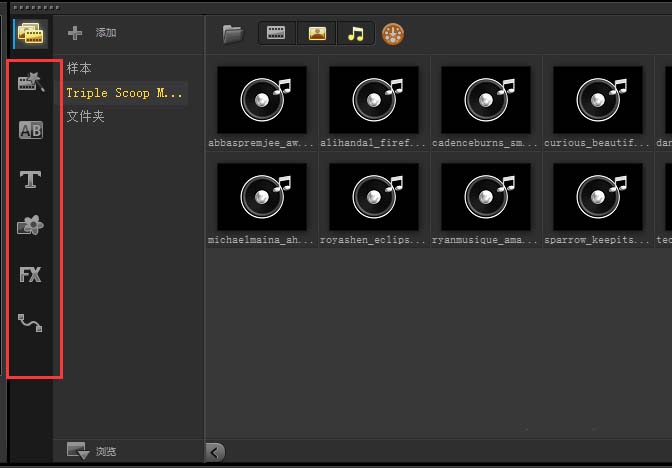 5、如图所示 整个系统默认的右边是【素材面板】最主要的作用是对素材进行保存和分类,在素材的面板的左边可以看到红色的框内分别有【转场 标题 图形 滤镜 路径】可以点开看看在用素材做编辑试试每一个的效果,其实从字面就大概可以理解它的作用。