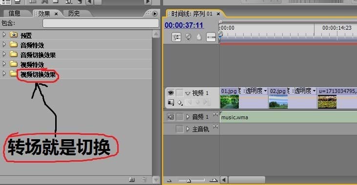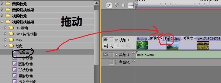 4、找到转场效果,任意选一个转场,拖动到两个图片素材之间(剩下的如法炮制)