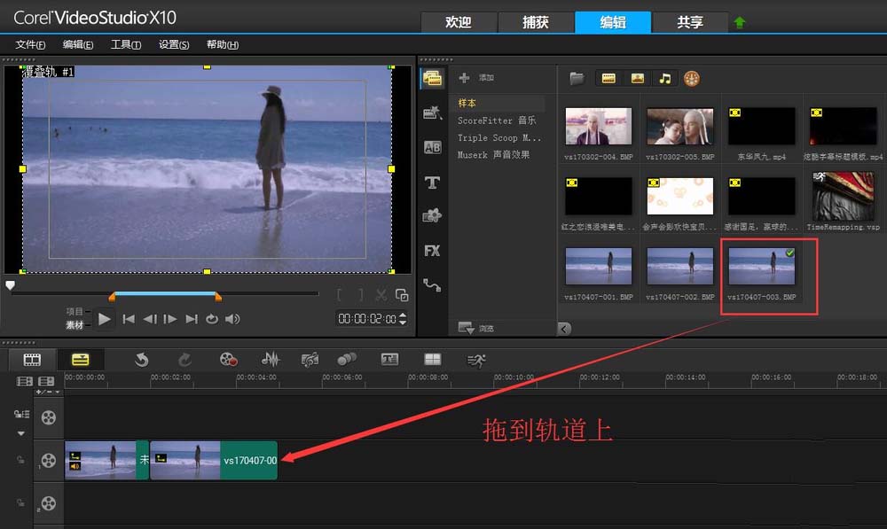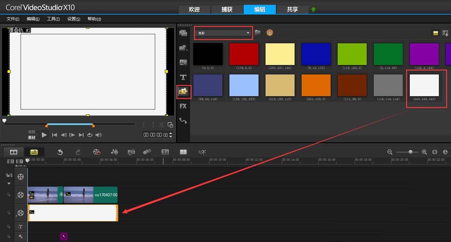 5、做到这一步其实还不是很像,所以还可以在细节上修饰一下,加一个闪白的效果。点击图像按钮,在类型中选择“色彩”,然后拖动白色色块到覆叠轨2上