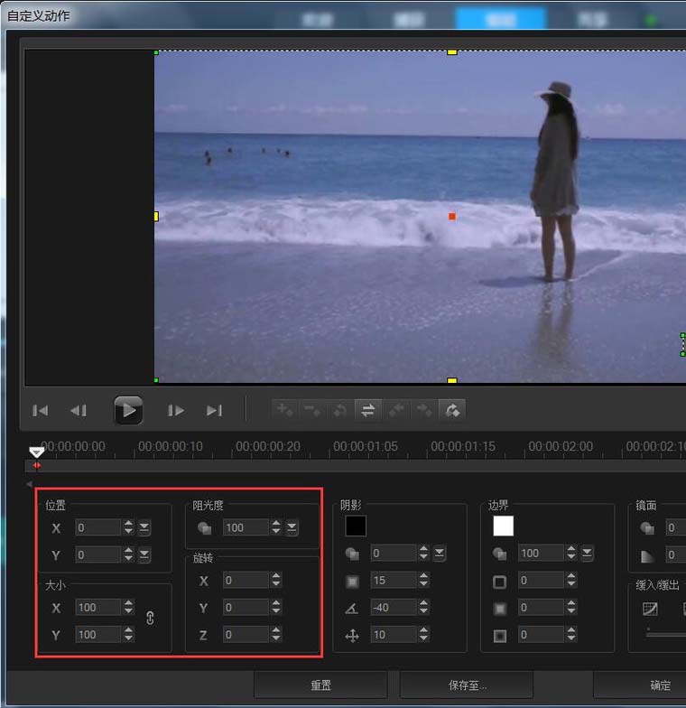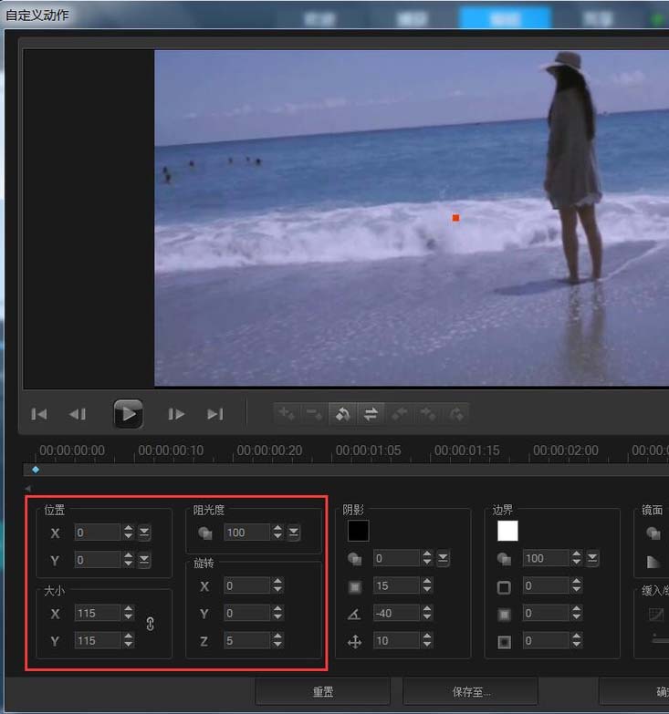 7、最后的旋转效果也很简单,在图片上右键单击,选择“自定义动作”,然后分别设置起始帧、终止帧的大小和旋转值就可以了,数值设置如下图