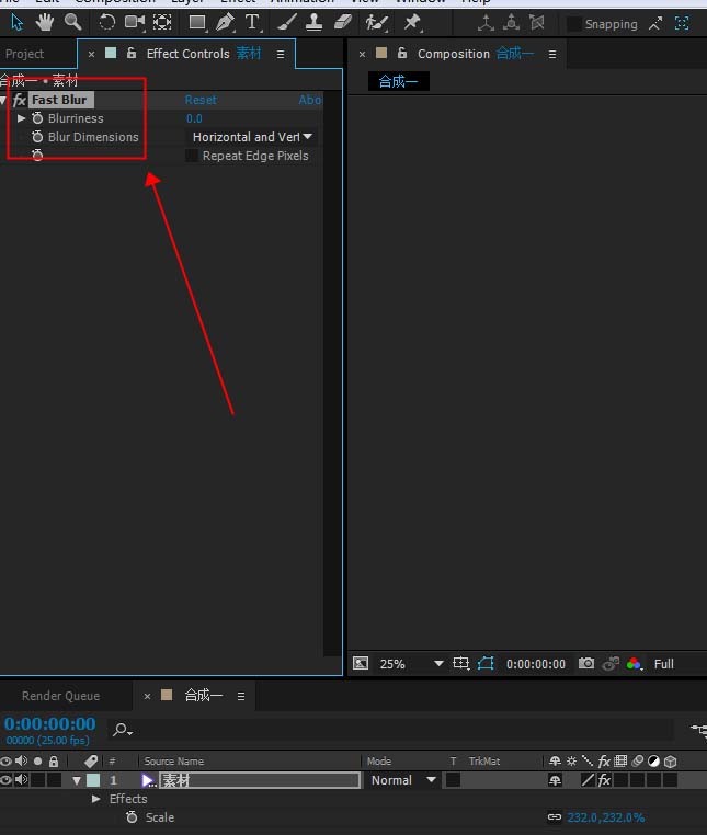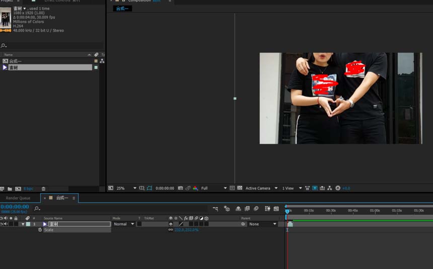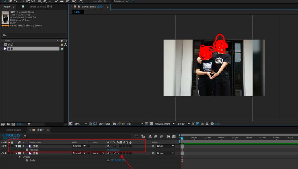 2、将手机视频素材拖入时间线,并将视频大小缩放至整个合成大小