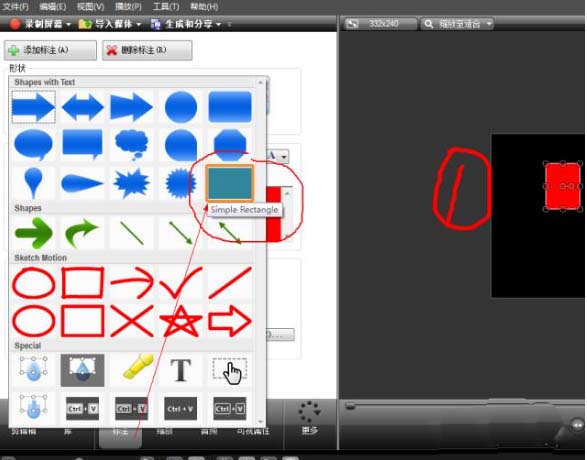 1、在标注中,选择“Shapes with Text”中的"Simple Rectangle",颜色用红色填充;