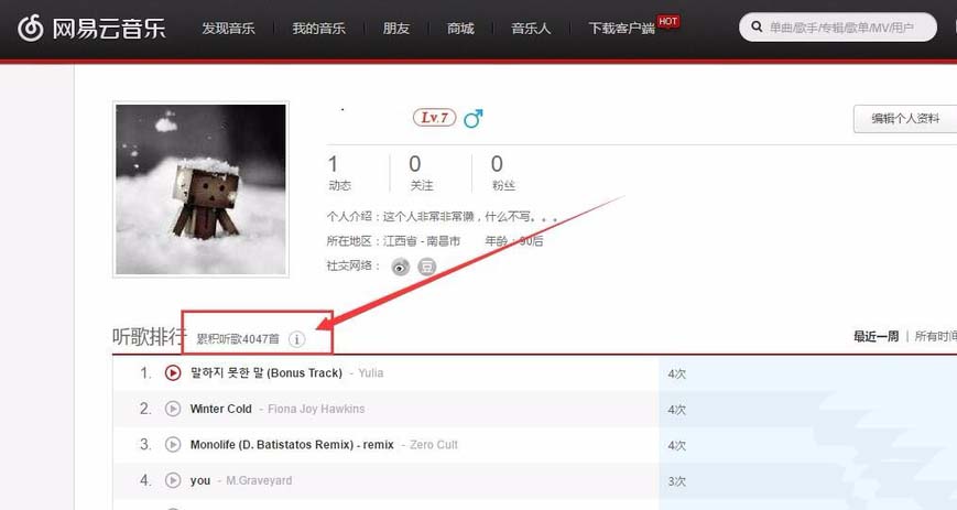 4、然后就可以看见自己听歌总数量咯,本人注册一年不到,4000首了,请问你们有没有这么多呀