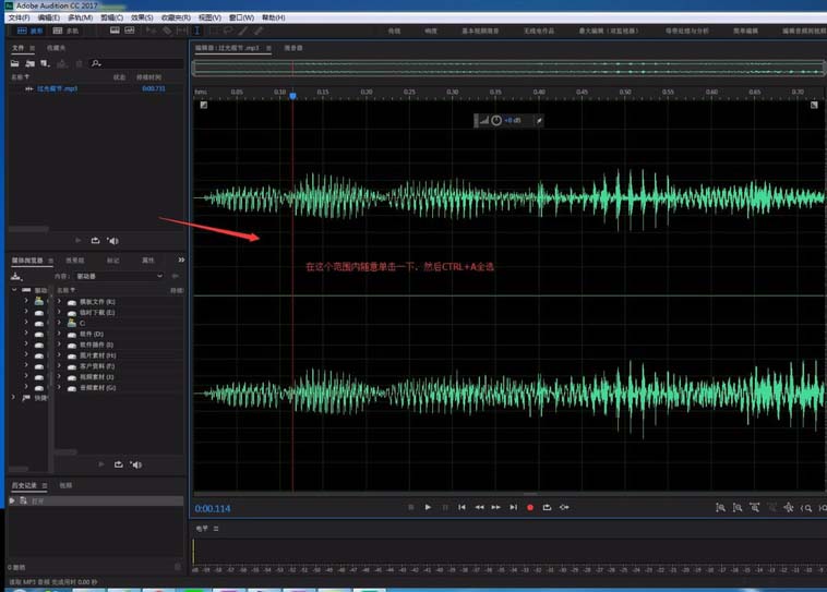 2、导入素材后在音频波形上随便点击一下,然后CTRL+A全选该波形文件。全选后的区域会变为白色背景。