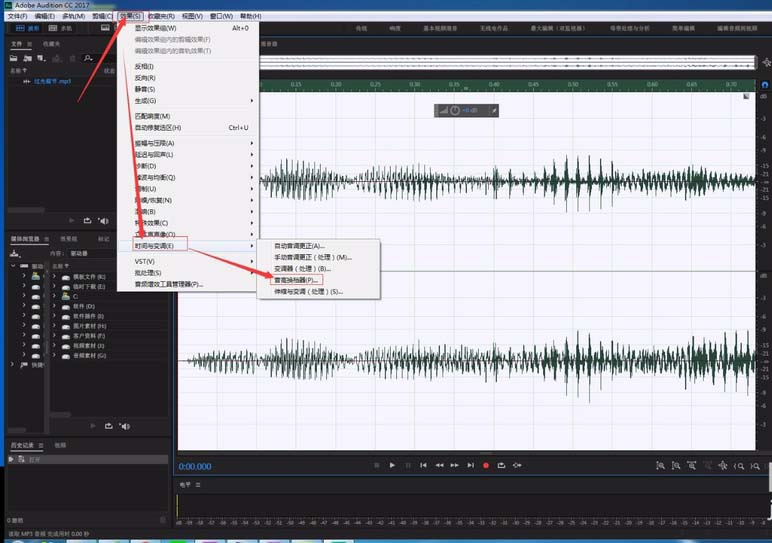 3、然后依次点击菜单栏的“效果”——“时间与变调“——“音高换挡器“。