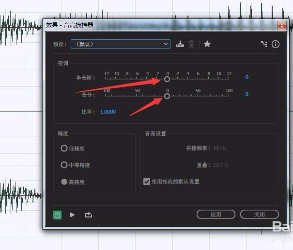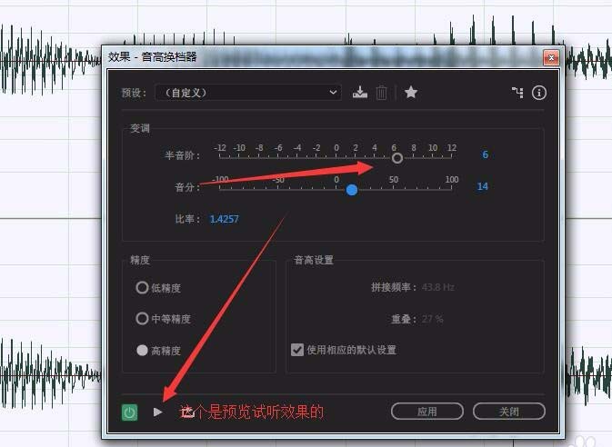 6、调整过的效果可以通过点击下面的一个播放按钮就想预览试听,达到自己想要的效果之后点击应用既可。