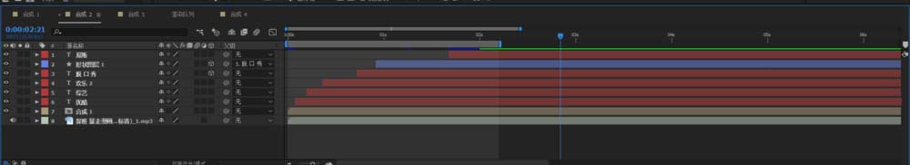 4、将文字层对准音频波形逐层添加对应到音频波形波动条位置。按照这个方法就可以制作出一个有节奏感的效果出来了。还有疑问尽管问我吧