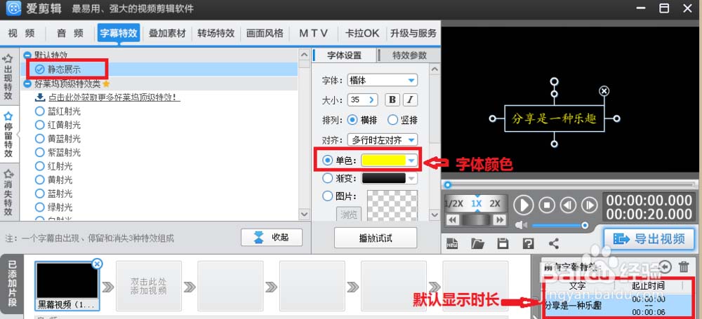 3、根据喜好设置字体颜色,字幕显示区域,默认显示时长为6秒。如图: