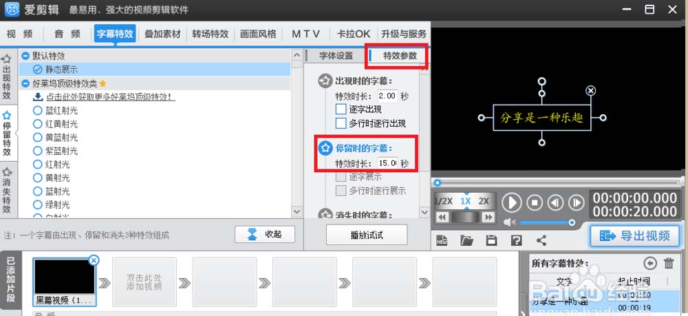 4、选择特效参数,设置--停留时的字幕--停留时长。如图:
