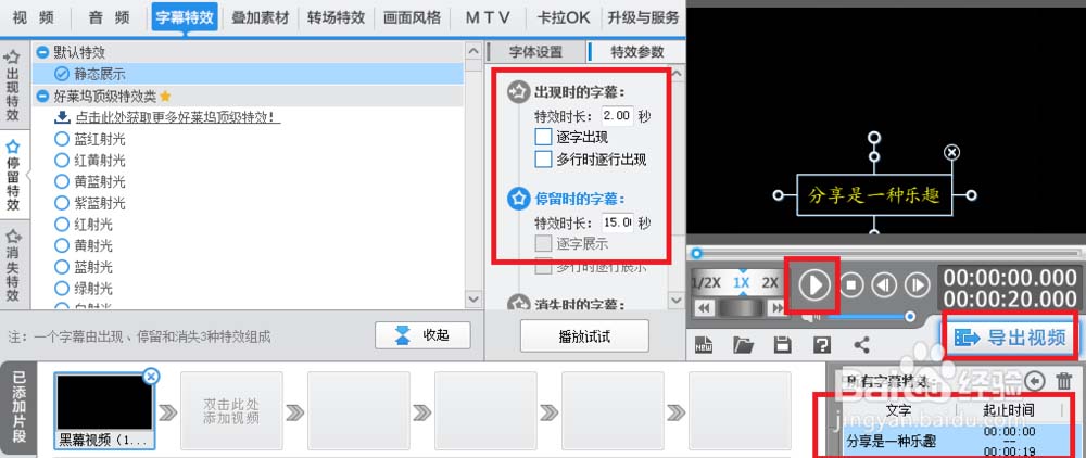 5、出现时的字幕特效时长+停留时的字幕特效时长+结束时的字幕特效时长=总字幕时长。如图: