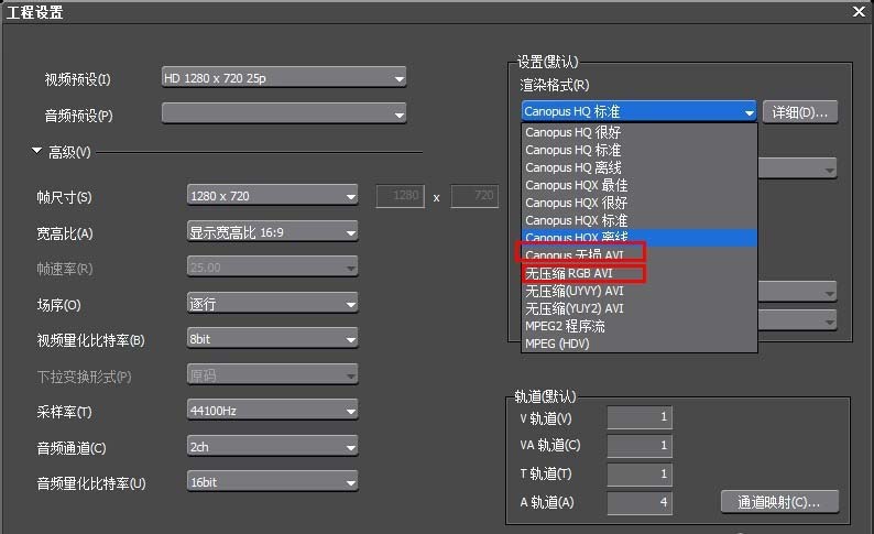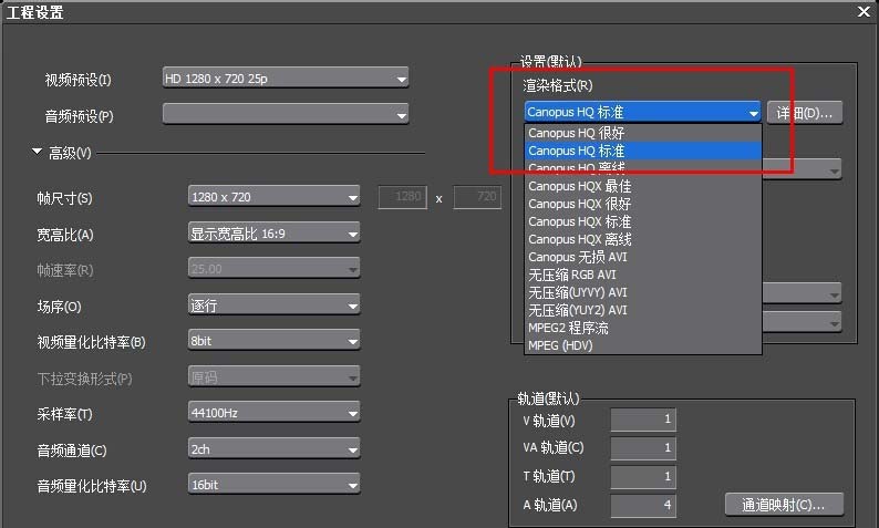 3、在详细的参数设置页面的右半部分找到“渲染格式”,一般EDIUS不能输出的时候,就是这个渲染格式在作怪。