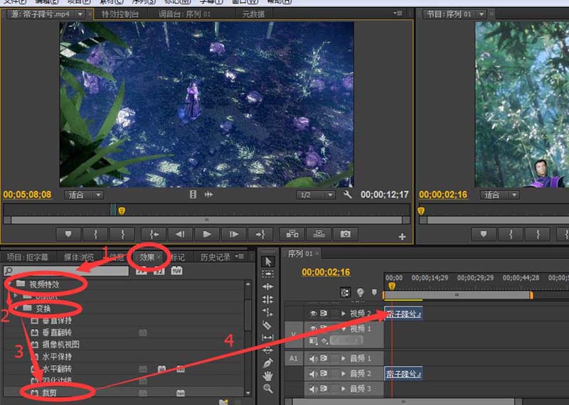4、在“效果”里选“视频特效”-“变换”-“裁剪”,按住“裁剪”拖到时间轴的视频上;