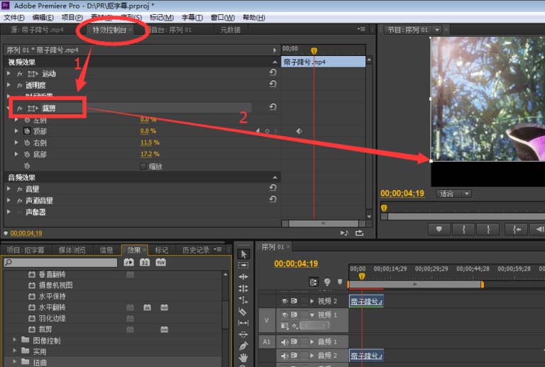 5、单击“特效控制台”-单击“裁剪”,然后就可以根据需要剪掉不想要的字幕部分了;