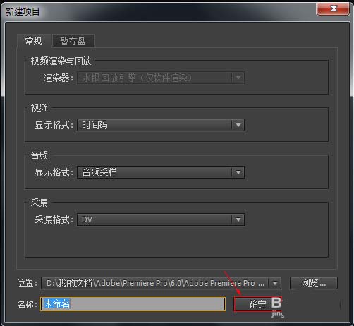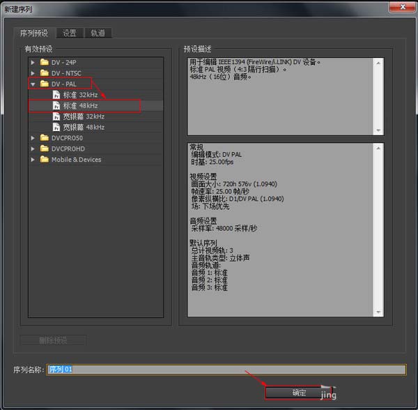 1、运行软件,新建一个项目。新建项目的对话框中,点击“确定”。 弹出新建序列窗口,一般我们选择的有效预设是DV-PAL-标准 48kHz,然后看到右边的预设描述中视频的画面大小是720h 576v,其实有效预设简单的理解为视频的画面的大小,序列名称也可进行命名。下一步点击确定。