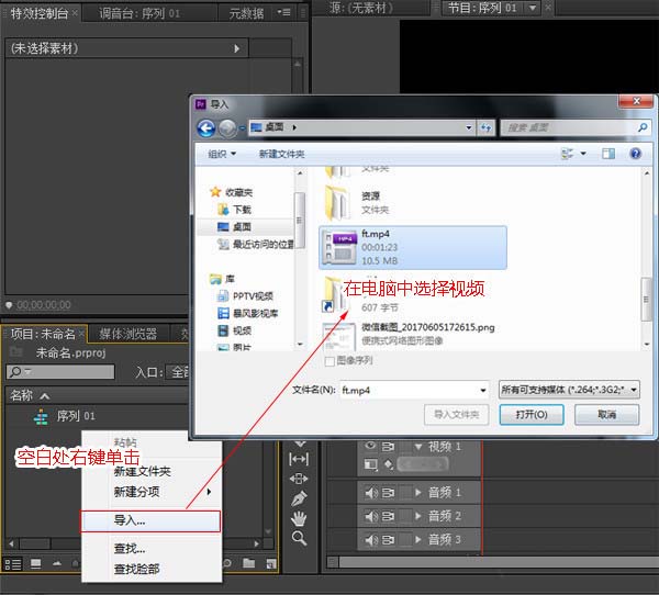 2、来到软件主界面中,在项目:未命名的框里空白处,点击鼠标右键出出现小框选项,点击“导入”即可。在弹出来的窗口里选择需要视频,并点“打开”。