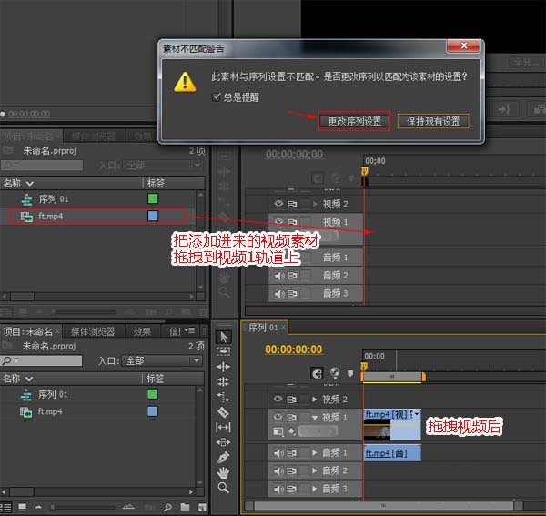 3、接着把添加进来的视频素材按住往右边的时间线里拖拽,拖拽到视频1轨道中,然后就会弹出一个提示框,选择“更改序列设置”就好。选择好以后视频就显示在视频1轨中了。